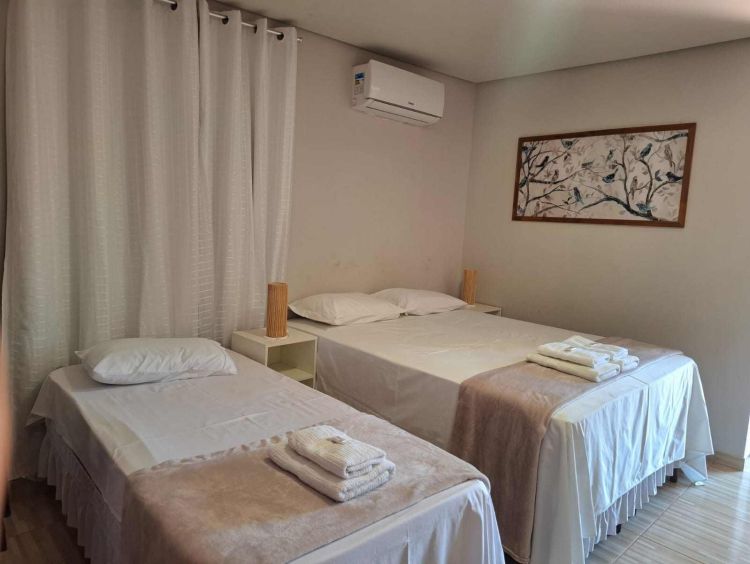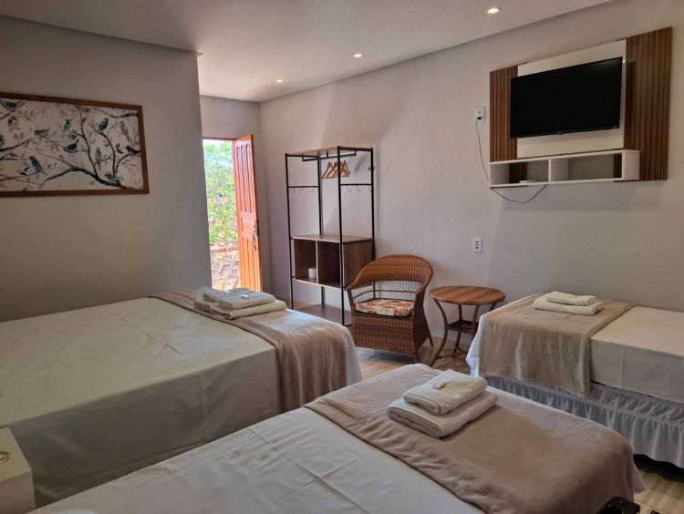Na acomodação superior até 4 pessoas dispomos de: cama box casal queem + 2 camas de solteiro, banheiro privativo e chuveiro elétrico, frigobar, ar condicionado split, roupa de cama e banho, internet wi-fi e varanda com vista para o jardim e para o sítio arqueologico alto do cruzeiro.